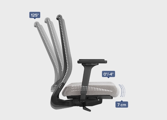 - Automatische Neigeverstellung von Sitz (bis -8° nach vorn) und Rückenlehne (bis 128° nach hinten), mehrfach arretierbar, fördert die natürlichen Bewegungsimpulse, hält die Konzentrationsfähigkeit aufrecht und steigert die Leistungsfähigkeit des Be-Sitzers