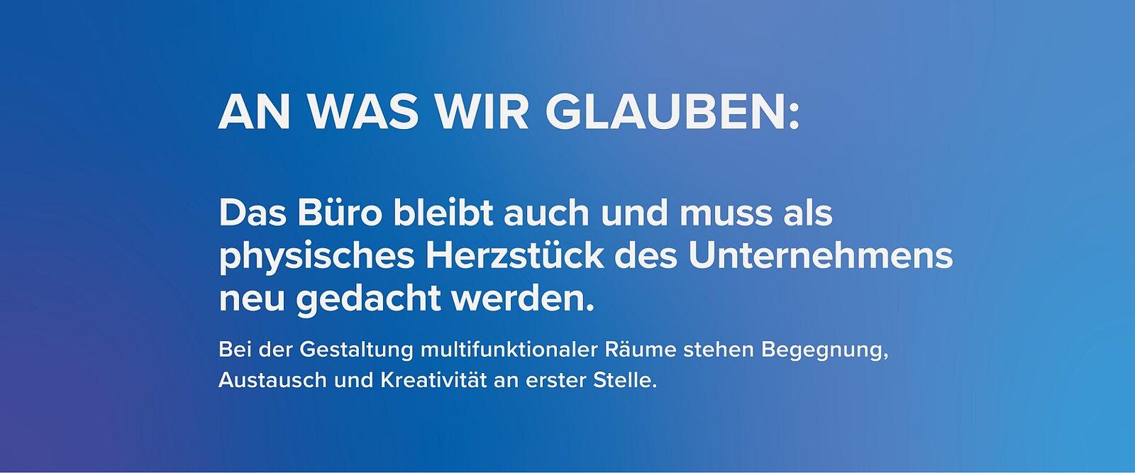 Dabei im Zentrum: Das Office. Ja. Genau. Richtig gehört. Wir glauben zwar fest daran, dass hybrides Arbeiten gekommen ist, um zu bleiben. Aber wir sind gerade deswegen der Überzeugung, dass das Office der Zukunft als physisches Herzstück des Unternehmens mehr denn je benötigt wird.