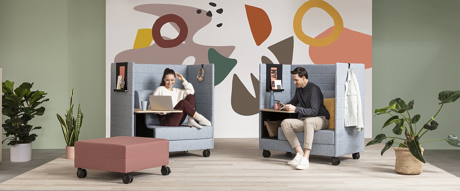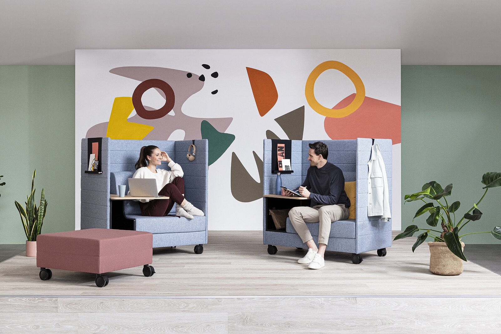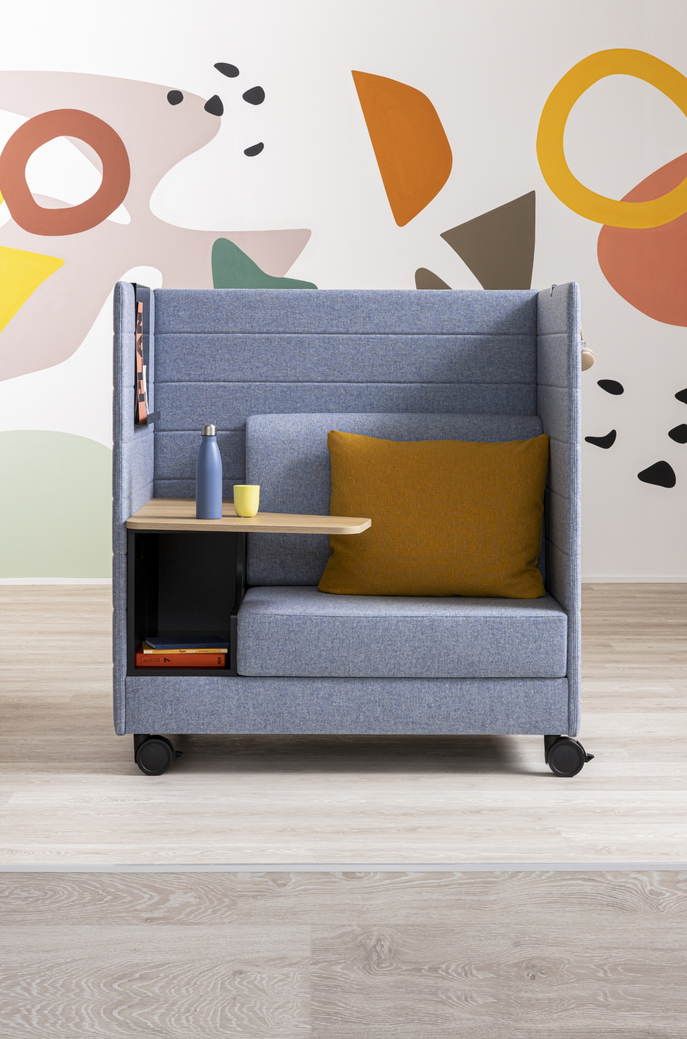 latérales et arrière au contour distinctif. Grâce à leurs roulettes, elles peuvent être positionnées sans effort et aménagées aisément en espace privé et en coworking.