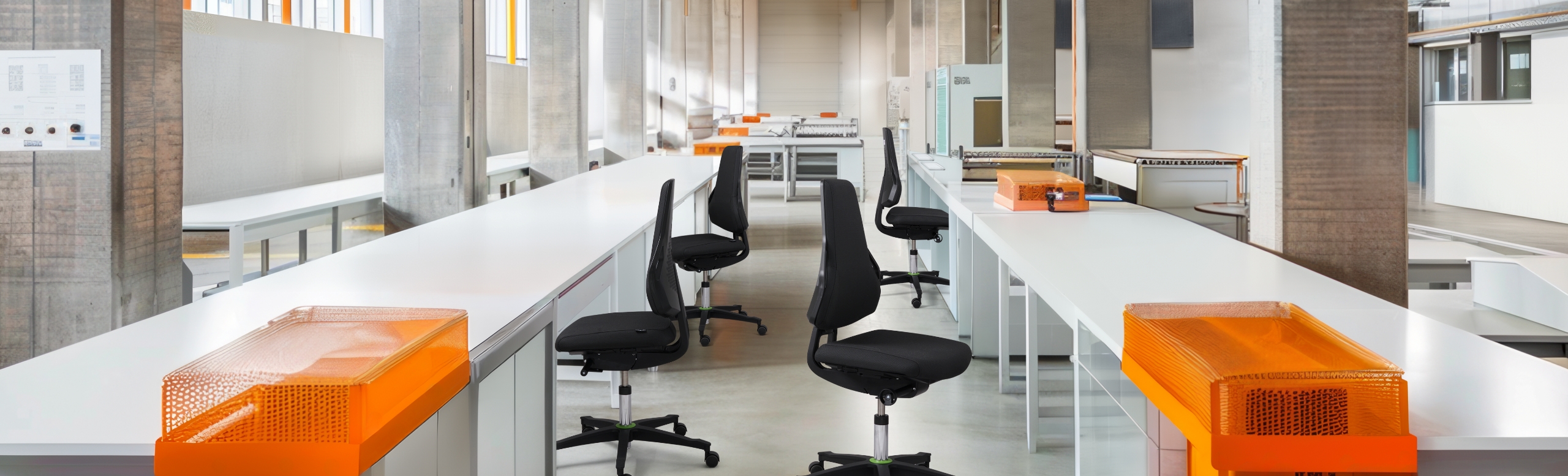 Dans la recherche, l’industrie et le commerce, il existe des secteurs particulièrement exigeants en matière de sécurité, de qualité des matériaux et de résistance. Que ce soit dans les salles de production, pour la fabrication de puces ou en laboratoire chimique: les sièges de travail, les tabourets ou produits pour le laboratoire, le poste de travail assis-debout ou encore le siège pour une utilisation 24 heures issus de ce programme sont parfaitement adaptés à toutes ces conditions spécifiques. Et ils garantissent aux hommes un maximum de sécurité, de confort et de performance tout au long de leur journée de travail.