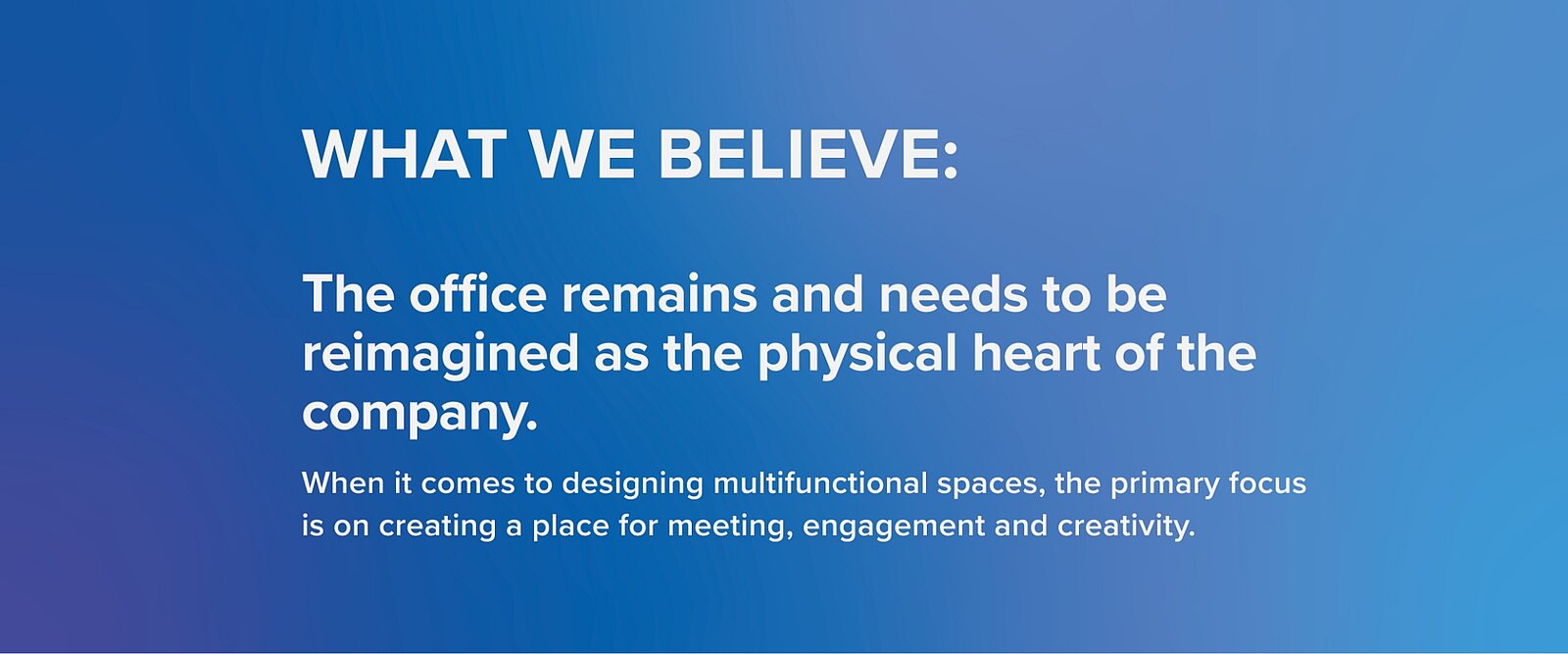 Avec comme dénominateur commun le bureau. Oui. C’est bien ça. Vous avez bien lu. Nous sommes certes tout à fait convaincus que l’avènement du travail hybride est fait pour durer. Mais c’est justement pour ça que nous avons aussi la certitude que le bureau du futur est plus que jamais de mise au cœur, littéralement, de l’entreprise.
